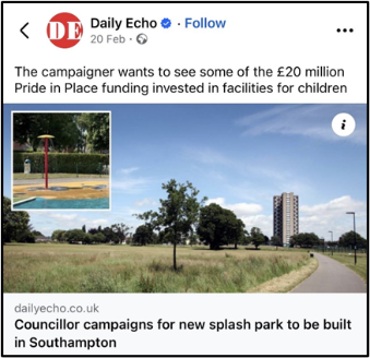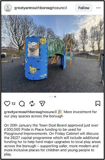 The focus on play was reinforced by the £18 million Playgrounds Fund, announced at the 2025 budget and with details shared in March 2026, “ensuring children in 66 of the most deprived communities have quality play spaces, with cash earmarked to buy new or upgrade playgrounds across the country from Tyneside to Torquay”. This fund not only coincides temporally with Pride in Place, but is also narratively connected with it; as Tom Hayes, MP for Bournemouth and chair of the relatively new All Party Parliamentary Group for Play, underlined: