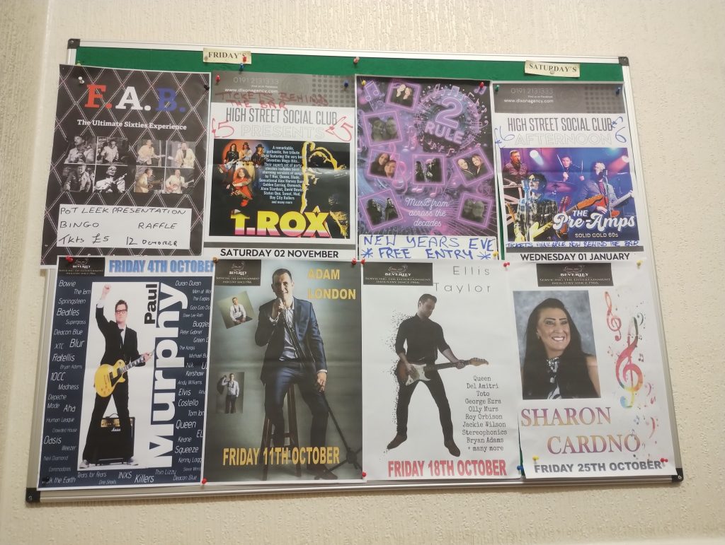 Using the case study of Stokeville, I’ve dipped my toes into some of the financial reasons for and against this, and shown that they depend on circumstance. But there’s another possible interpretation of this 1989 quote: music, in so many cases, makes clubs what they are. For Finnegan, the demand for music and the responsibility to put it on was a key feature that distinguished social clubs in the working-men’s-club cultural traditions from similar groups such as workplace clubs. Paying more attention to this should be an important part of figuring out how to keep them going into the future.