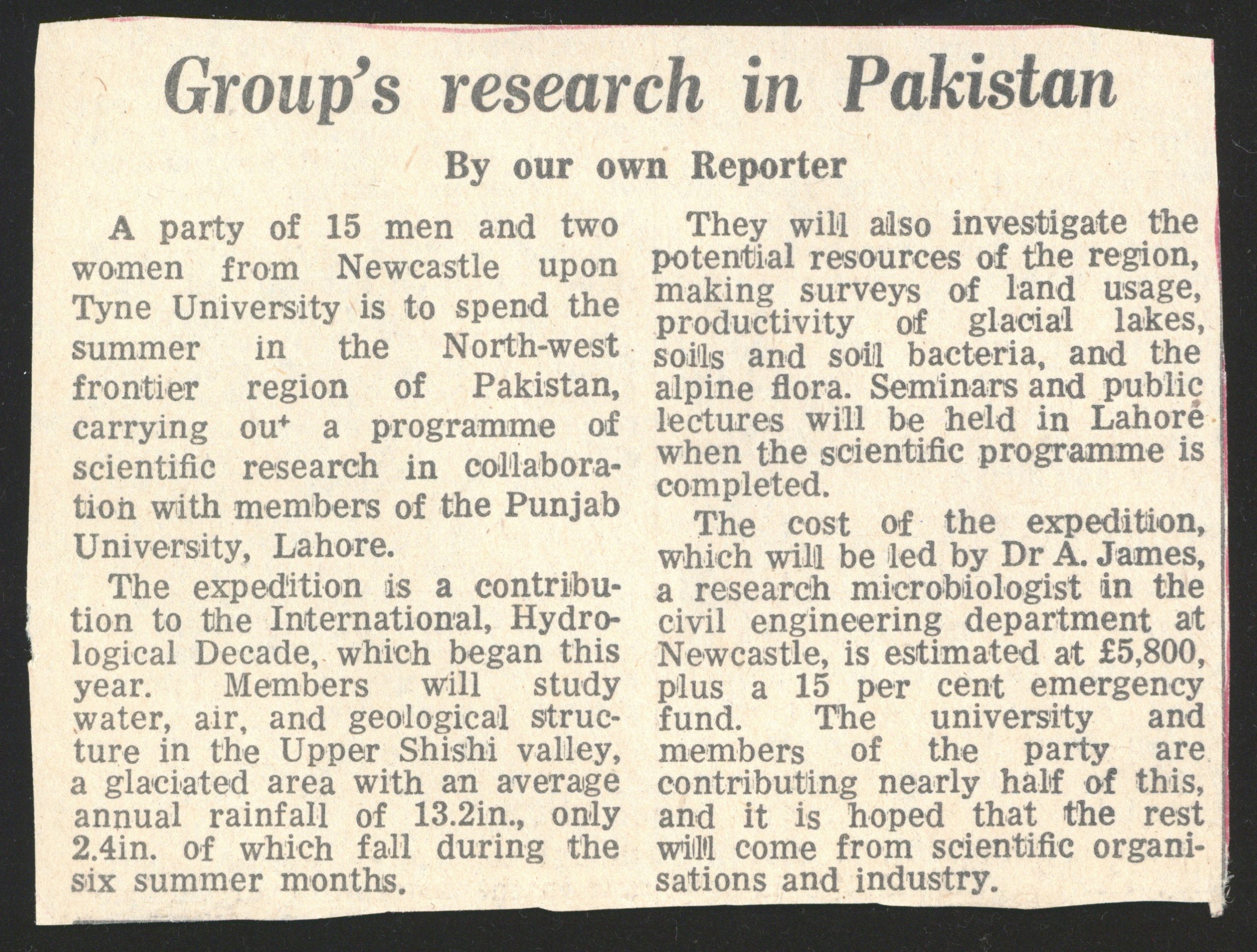 The expedition, which Howard was prepared to donate information, was significantly different in scale and aspirations. This was an expedition that was university staff led and directly sponsored by Newcastle University. It was planned in the first year of independence from the University of Durham and was inter-disciplinary, aiming to support the research of the International Hydrological Decade. Major financial contributions to the expedition were given by institutions such as the Royal Geographical Society and Mount Everest Foundation.